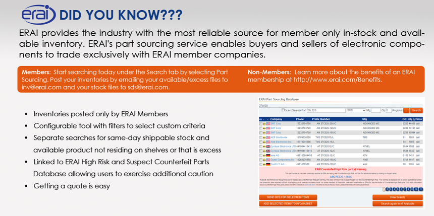 ERAI urges all suppliers/vendors to check your records and/or inventory to determine if you received any of the affected products and, if so, to contact your customers regarding the possibility that the items were shipped with falsified data. You are also encouraged to inform ERAI in the event you did receive some of these products.